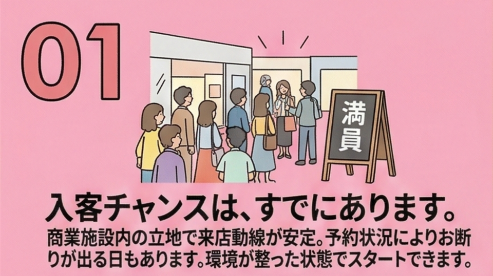 - 商業施設内で来店導線があり、入客が安定しやすい