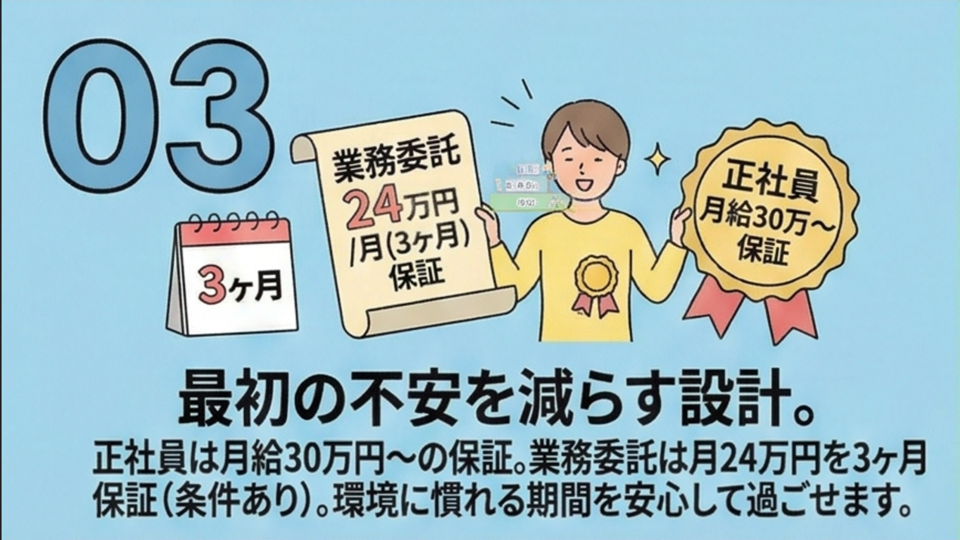正社員は「月給30万円〜(保証)」、業務委託は「60%還元+3ヶ月保証24万円(条件あり)」でスタート可能。