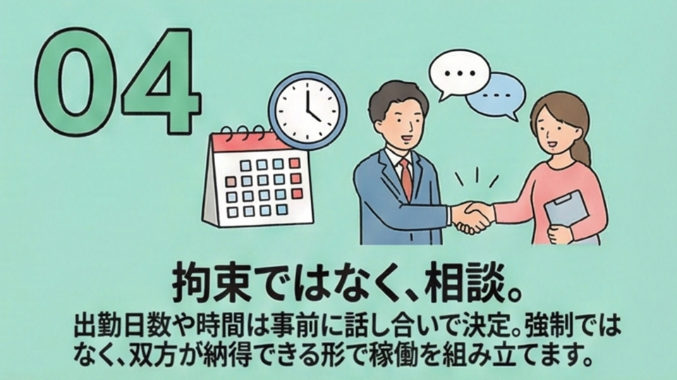 - 働き方:ご希望を伺い、無理のない形で設計します
