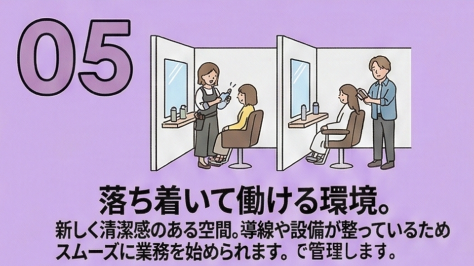 スタイリスト経験1年以上の方歓迎(ブランク相談OK)。