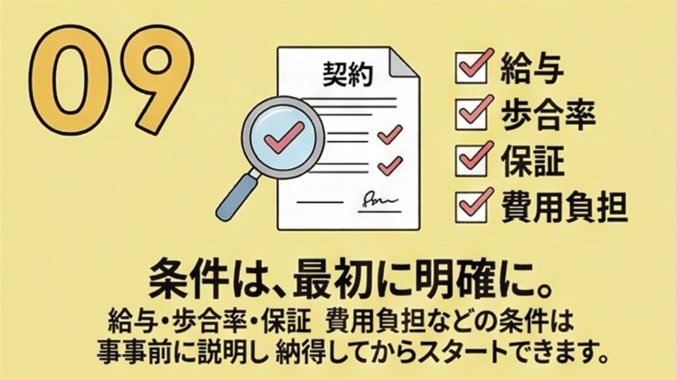 ※材料費・光熱費・広告費などの取り扱いも、条件として明確にご説明します。
